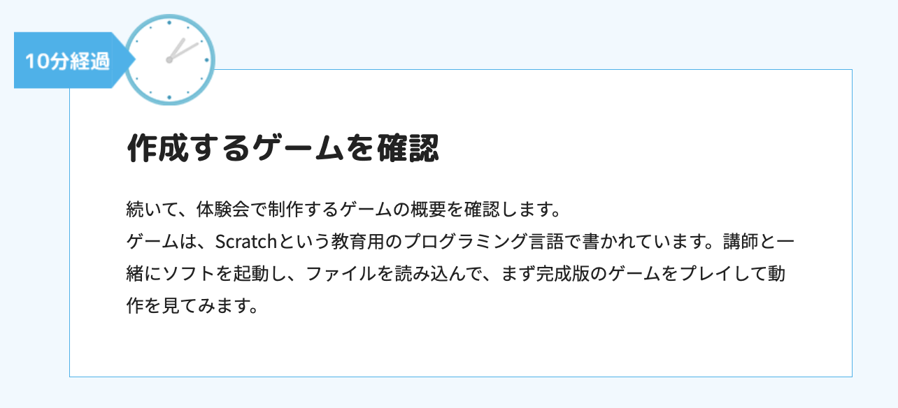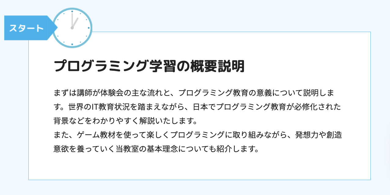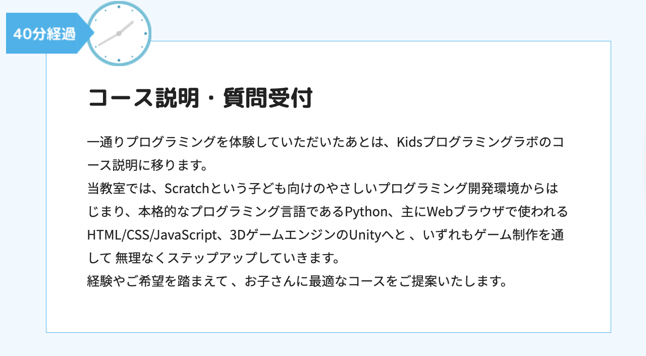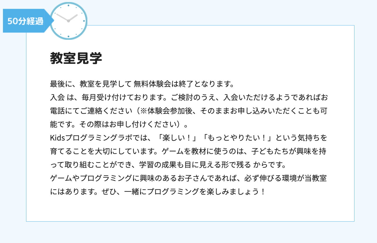 Kidsプログラミングラボの無料体験会の主な流れを紹介します。