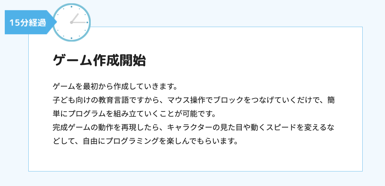 オンライン体験会でも、ゲーム制作を通してプログラミングに触れるという基本形は変わりません。